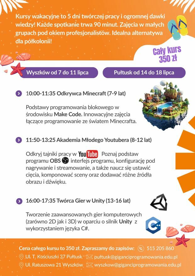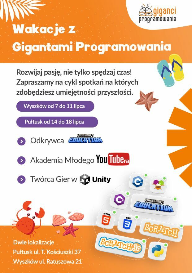 Wakacje z Gigantami ProgramowaniaLato tuż za rogiem, a my już dziś zapraszamy Was na niezwykłą przygodę z technologią i kreatywnością! W ramach wakacyjnych kursów przygotowaliśmy 5 spotkań od poniedziałku do piątku, które będą prawdziwą eksplozją wiedzy, zabawy i rozwoju kompetencji przyszłości!