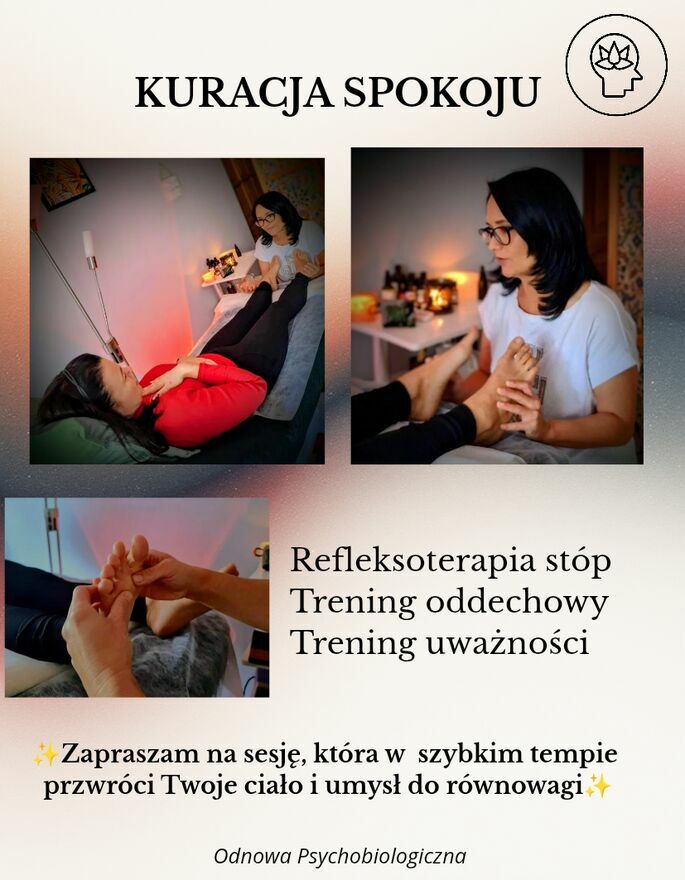 Kuracja Spokoju – refleksoterapia stóp połączona z treningiem oddechowym i uważności. Pomaga uwolnić napięcia, wyciszyć umysł i przywrócić wewnętrzną równowagę.