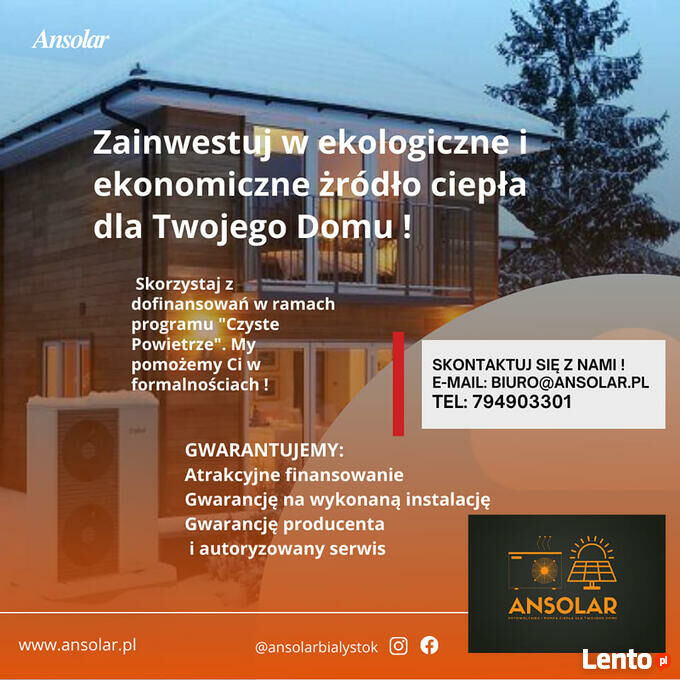 ANSOLAR Andrzej Nowiczenko- firma z siedzibą w Białymstoku ul. Upalna 1A/44 – dostawca energii odnawialnej. Wykonujemy instalacje fotowoltaiczne, pomp ciepła, magazynów energii.Pomagamy w odpowiednim doborze najlepszych rozwiązań dla inwestorów indywidualnych i biznesowych.