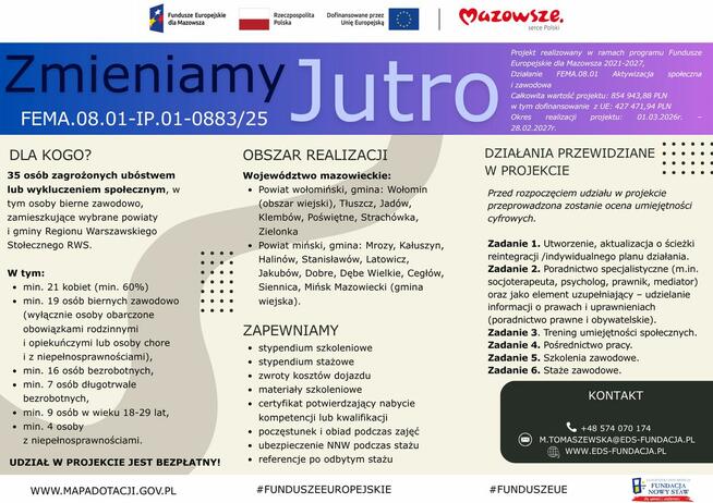 ZAPRASZAMY DO UDZIAŁU W PROJEKCIE "ZMIENIAMY JUTRO" DLA KOGO? 35 osób zagrożonych ubóstwem lub wykluczeniem ...